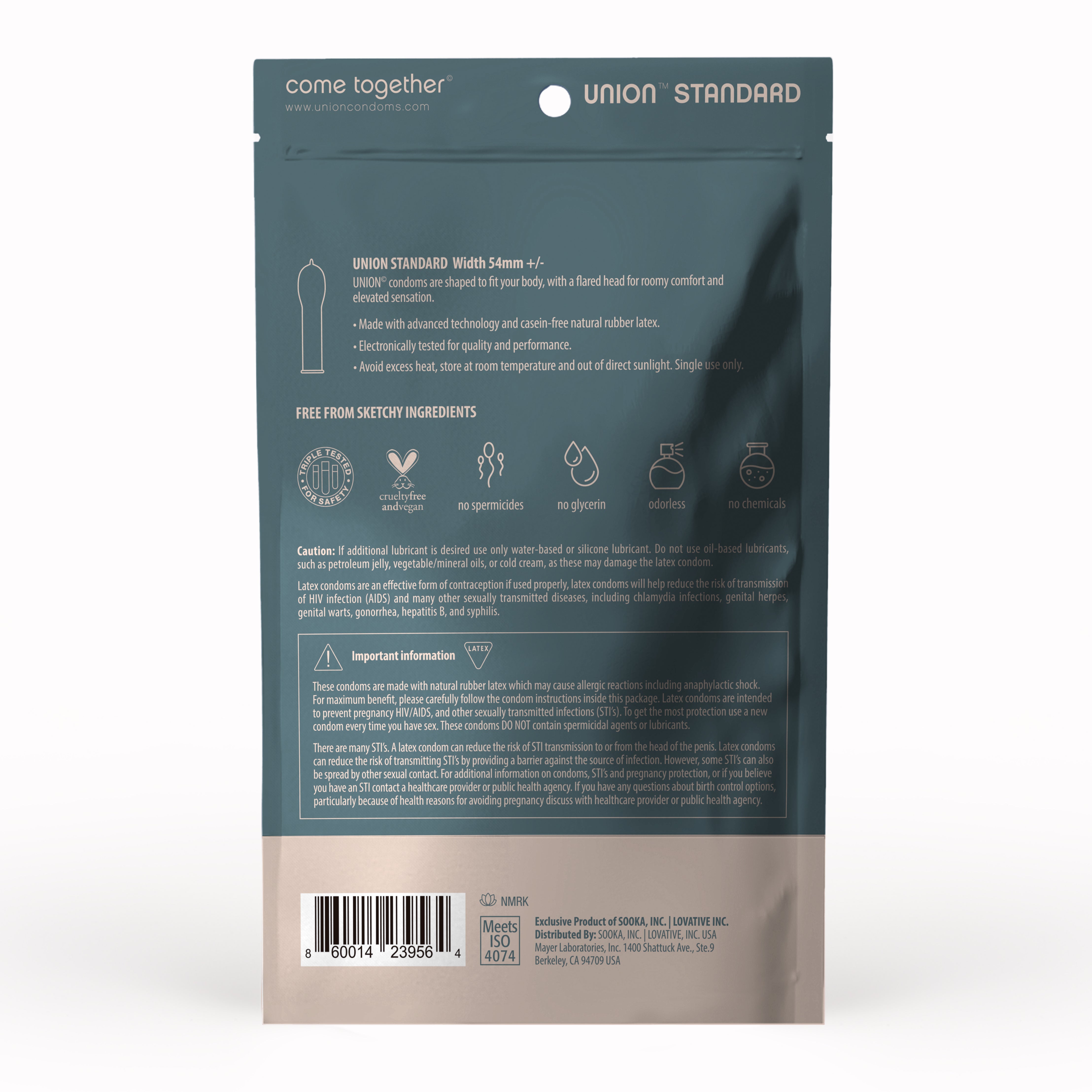UNION STANDARD features a 54mm straight shaft and a flared head, offering a tailored fit that enhances comfort and pleasure for both partners—without compromising on security. It’s a medium-sized condom crafted to fit most men, engineered for reliable performance and responsive pleasure.
